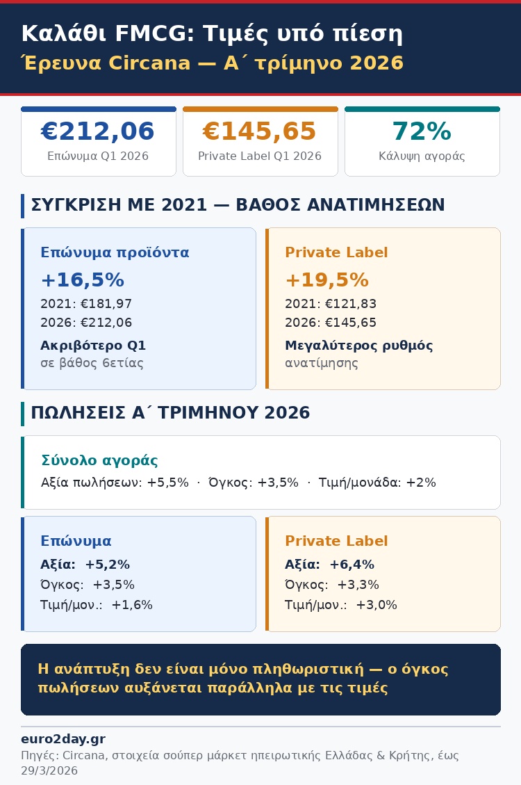 Σημάδια διατηρούμενης πίεσης στις τιμές βασικών καταναλωτικών αγαθών καταγράφει η τελευταία έρευνα της Circana για την αγορά ταχυκίνητων προϊόντων. Η ανάλυση καλύπτει την περίοδο έως την εβδομάδα που έληξε στις 29 Μαρτίου 2026 και βασίζεται σε στοιχεία από σούπερ και υπερμάρκετ σε όλη την ηπειρωτική Ελλάδα και την Κρήτη.