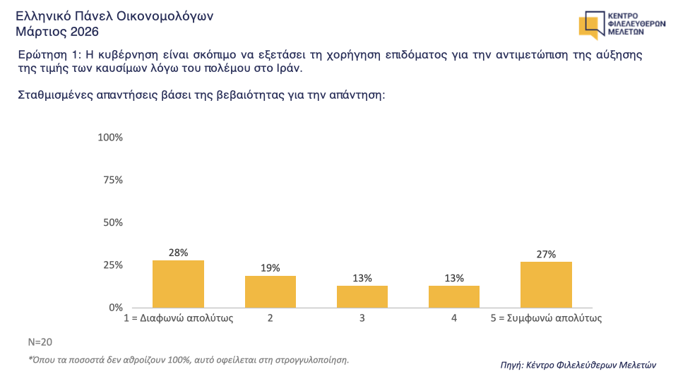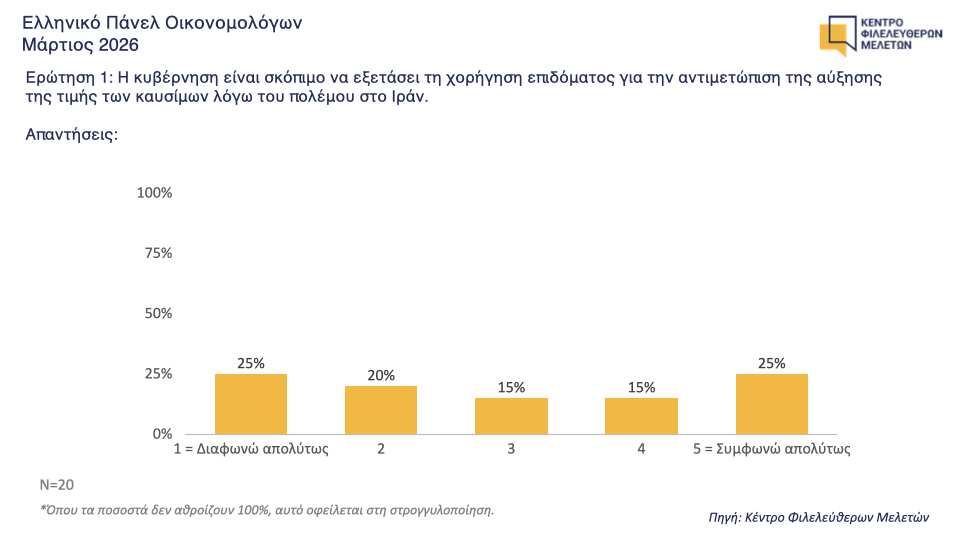 Σχεδόν ισομερώς μοιρασμένες είναι οι απαντήσεις των μελών του Ελληνικού Πάνελ Οικονομολόγων του ΚΕΦΙΜ απέναντι στο επίδομα για την αντιμετώπιση της αύξησης της τιμής των καυσίμων λόγω του πολέμου στο Ιράν.