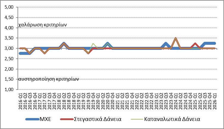 Κατά το α΄ τρίμηνο του 2026, τα κριτήρια χορήγησης στεγαστικών και καταναλωτικών δανείων προς τα νοικοκυριά παρέμειναν αμετάβλητα σε σχέση με το δ΄ τρίμηνο του 2025 (Διάγραμμα 1), ενώ αμετάβλητα αναμένεται να παραμείνουν και κατά τη διάρκεια του β΄ τριμήνου του 2026. Οι συνολικοί όροι χορήγησης στεγαστικών δανείων έγιναν πιο αυστηροί ως έναν βαθμό, λόγω των αυξήσεων στις επιβαρύνσεις των δανείων εκτός τόκων, κατά την διάρκεια του α΄ τριμήνου του 2026. Οι συνολικοί όροι χορήγησης των καταναλωτικών και λοιπών δανείων παρέμειναν αμετάβλητοι για το α΄ τρίμηνο του 2026.