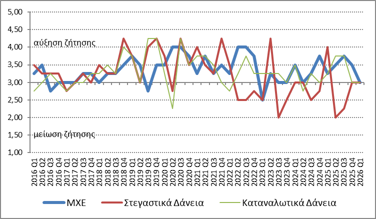 Η ζήτηση για στεγαστικά και καταναλωτικά δάνεια παρέμεινε αμετάβλητη κατά το α΄ τρίμηνο του 2026 (Διάγραμμα 2), ενώ αμετάβλητη αναμένεται να παραμείνει και κατά το β΄ τρίμηνο του 2026.
