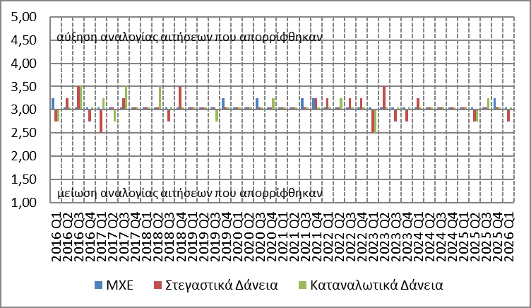 Κατά το α΄ τρίμηνο του 2026, η αναλογία των αιτήσεων για στεγαστικά δάνεια που απορρίφθηκαν παρέμεινε σχεδόν αμετάβλητη, ενώ για καταναλωτικά παρέμεινε αμετάβλητη (Διάγραμμα 3).