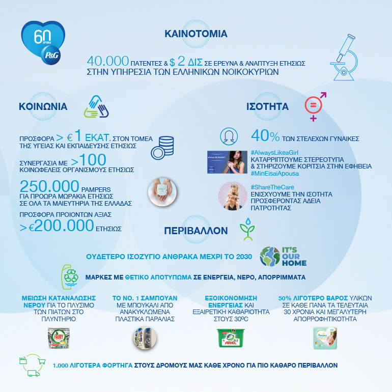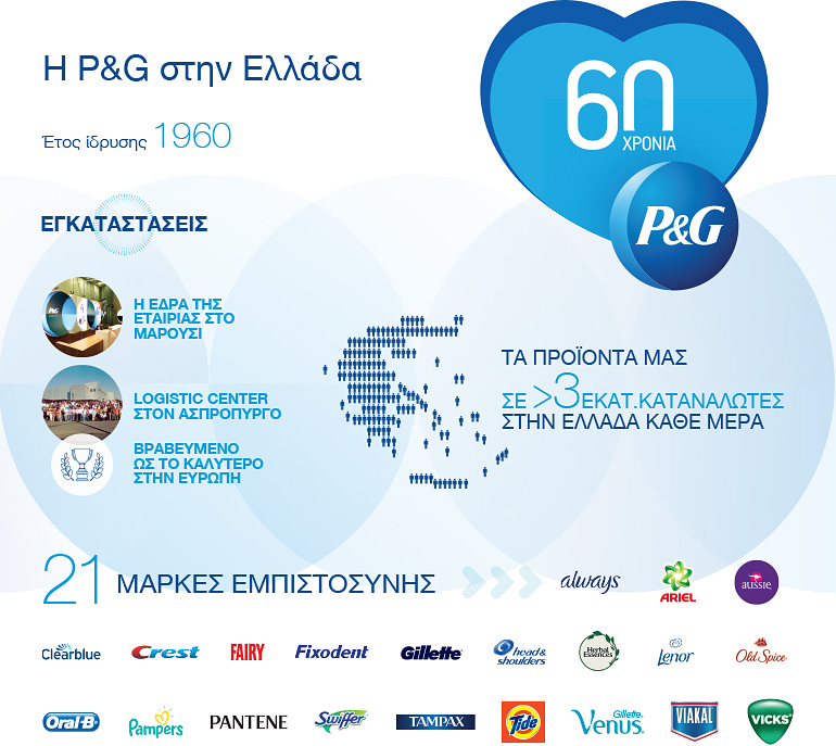 Φέτος, η P&G γιορτάζει τα 60 χρόνια της στην Ελλάδα! 6 δεκαετίες παρουσίας στη ζωή χιλιάδων ελληνικών οικογενειών, οι οποίες εμπιστεύονται τα προϊόντα της εταιρίας για αξίες δοκιμασμένες αλλά καλωσορίζουν παράλληλα και την καινοτομία που αγαπημένα σήματα όπως τα Pampers, η Always, το Ariel και το Fairy φέρνουν στη ζωή τους.