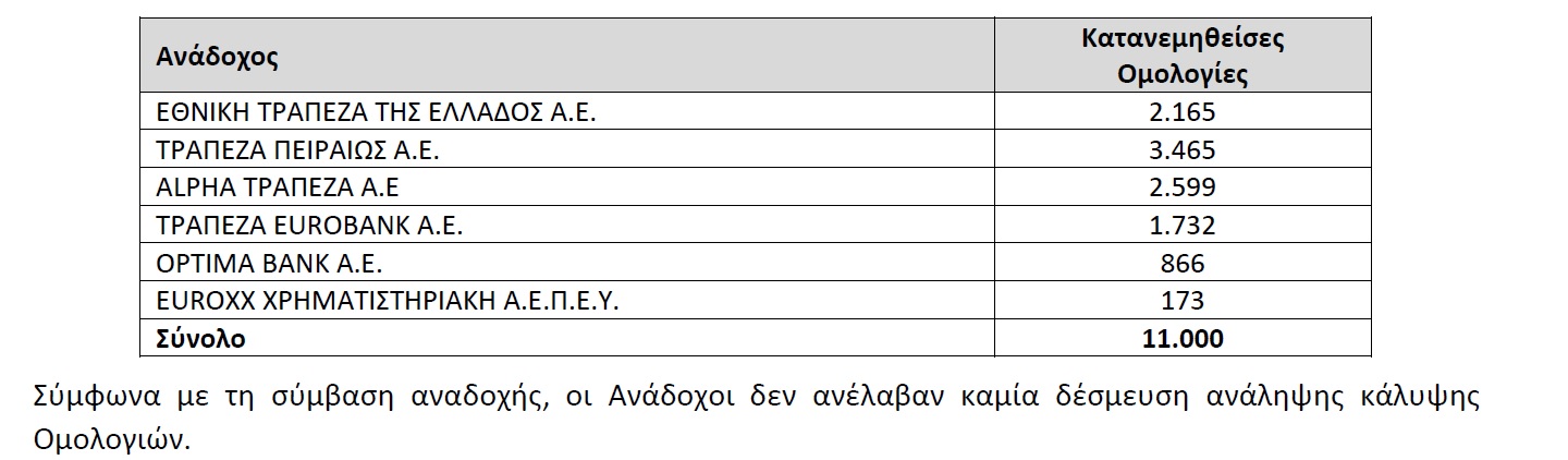 Επίσης, από τις 42.000 Ομολογίες που κατανεμήθηκαν σε Ειδικούς Επενδυτές, οι Ανάδοχοι έλαβαν για δικό τους λογαριασμό 11.000 Ομολογίες ως ακολούθως: