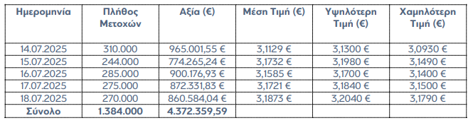 Η «Eurobank Ergasias Υπηρεσιών και Συμμετοχών Ανώνυμη Εταιρεία» («Eurobank Holdings»), σε συνέχεια της από 07.05.2025 ανακοίνωσής της σχετικά με την έναρξη εφαρμογής του Προγράμματος Επαναγοράς Ιδίων Μετοχών («Πρόγραμμα»), που εγκρίθηκε με την απόφαση της Τακτικής Γενικής Συνέλευσης των Μετόχων της Eurobank Holdings στις 30.04.2025 και σε συνέχεια της από 30.04.2025 απόφασης του Διοικητικού Συμβουλίου της, ενημερώνει το κοινό ότι κατά το διάστημα 14/07/2025 – 18/07/2025 απέκτησε συνολικά, στο πλαίσιο του Προγράμματος, 1.384.000 μετοχές εκδόσεως της ιδίας («Ίδιες Μετοχές») που διαπραγματεύονται στο Χρηματιστήριο Αθηνών («Χ.Α.»), με μέση τιμή κτήσης €3,1592, ανά μετοχή και συνολικό κόστος €4.372.359,59.