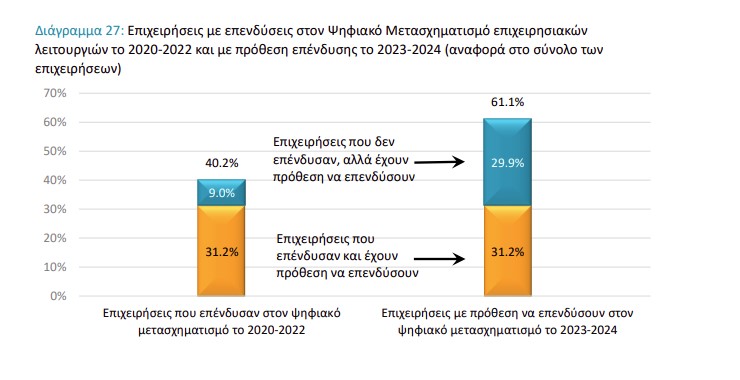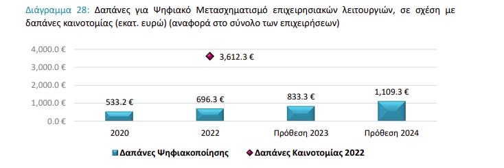 Σύμφωνα με την έρευνα, για το 2022 οι δαπάνες των επιχειρήσεων για ψηφιακό μετασχηματισμό έφτασαν τα 696,3 εκατ. ευρώ. Εν συγκρίσει, οι δαπάνες για καινοτομικές δραστηριότητες για το ίδιο έτος ανήλθαν περίπου στα 3,6 δισ. ευρώ.