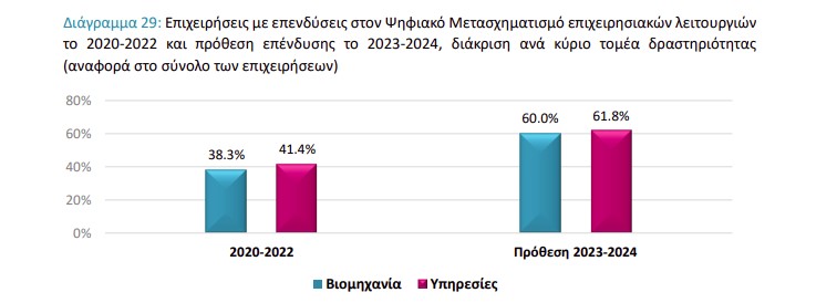 Συγχρόνως, όπως επισημαίνεται εντός της έρευνας, από τους δείκτες με διάκριση ανά κύριο τομέα δραστηριότητας προκύπτει μια ισορροπημένη εικόνα μεταξύ των επιχειρήσεων με κύρια δραστηριότητα τις Υπηρεσίες και των επιχειρήσεων με κύρια δραστηριότητα τη Βιομηχανία, τόσο ως προς τις επενδύσεις της περιόδου 2020-2022, όσο ως προς την πρόθεση επενδύσεων της περιόδου 2023-2024 για ψηφιακό μετασχηματισμό επιχειρησιακών λειτουργιών.