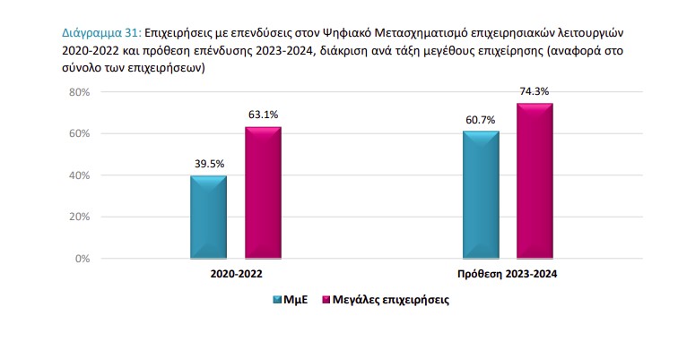Την ίδια ώρα, όσον αφορά τους δείκτες με διάκριση ανά τάξη μεγέθους επιχείρησης, προκύπτει ότι οι μεγάλες επιχειρήσεις επένδυσαν στον ψηφιακό μετασχηματισμό επιχειρησιακών λειτουργιών σε μεγαλύτερο βαθμό από τις ΜμΕ για την περίοδο 2020-2022, αλλά η συγκεκριμένη διαφορά τείνει να μειωθεί την περίοδο 2023-2024.