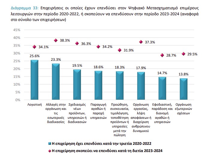 Τέλος, σύμφωνα με την έρευνα, οι λειτουργίες για τον ψηφιακό μετασχηματισμό των οποίων σκόπευε η πλειονότητα των επιχειρήσεων να επενδύσει για την περίοδο 2023-2024 ήταν οι αλλαγές στην οργάνωση και τις εσωτερικές διαδικασίες (38,3%) και η οργάνωση εργασίας, λήψη αποφάσεων ή διαχείριση ανθρώπινου δυναμικού (37,3%).