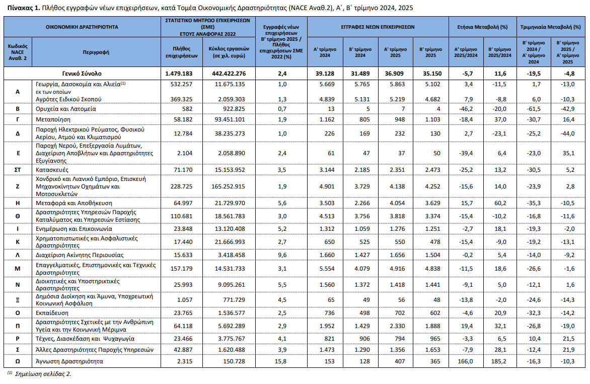 Ειδικότερα, οι εγγραφές νέων επιχειρήσεων για το σύνολο των τομέων της οικονομίας το β΄ τρίμηνο 2025 ανήλθαν σε 35.150, παρουσιάζοντας αύξηση 11,6% σε σχέση με το β΄ τρίμηνο 2024 που είχαν ανέλθει σε 31.489 και μείωση 4,8% σε σχέση με το Α’ τρίμηνο 2025 που είχαν ανέλθει σε 36.909.