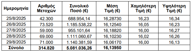 O Οργανισμός Τηλεπικοινωνιών της Ελλάδος Α.Ε. ανακοινώνει ότι στο πλαίσιο του Προγράμματος Απόκτησης Ιδίων Μετοχών για το 2025, την περίοδο από 25/08/2025 – 29/08/2025, αγόρασε συνολικά 314.820 ίδιες μετοχές, ως ακολούθως: