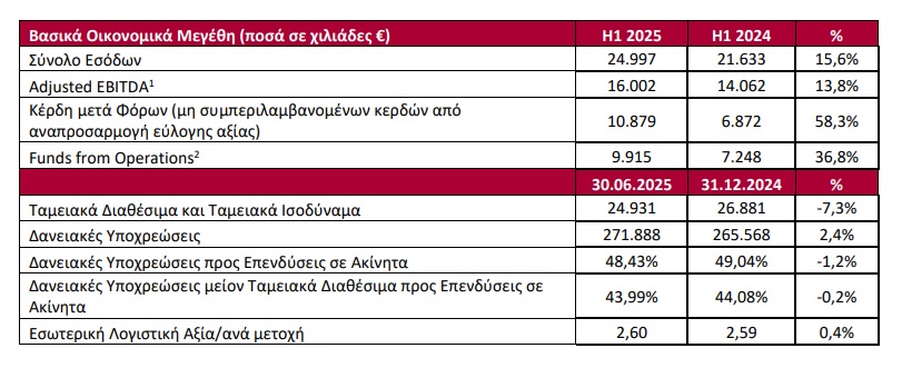 - Τα Καθαρά Κέρδη, μη συμπεριλαμβανομένων των κερδών από την αναπροσαρμογή της εύλογης αξίας των επενδύσεων σε ακίνητα* ανήλθαν σε 10,9 εκατ. ευρώ έναντι 6,9 εκατ. ευρώ (αυξημένα κατά 58,3%) σε σύγκριση με το Α’ Εξάμηνο 2024.