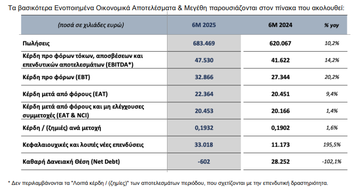 Σε σύγκριση με το αντίστοιχο εξάμηνο του 2024, οι πωλήσεις σημείωσαν αύξηση 10,2%, η λειτουργική κερδοφορία (EBITDA) 14,2%, τα κέρδη προ φόρων (ΕΒΤ) 20,2% και τα καθαρά κέρδη μετά από φόρους (ΕAΤ) 9,4%. Σημειώνεται ότι τα μεγέθη του Α’ εξαμήνου 2025 περιλαμβάνουν και την εταιρεία Μπενρουμπή η οποία ενσωματώθηκε στον όμιλο την 1η Φεβρουαρίου 2025.
