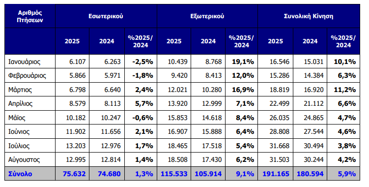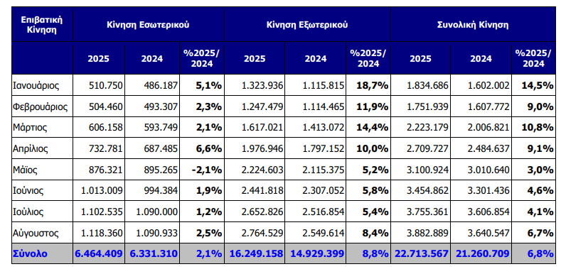 Σημείωση: Τα στατιστικά κίνησης του Αυγούστου 2025 είναι προκαταρκτικά και ενδέχεται να αλλάξουν. Τα στοιχεία κίνησης του κάθε μήνα οριστικοποιούνται μετά την 20η του επόμενου μήνα.