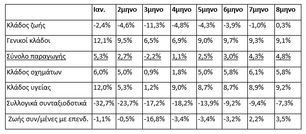 Ειδικότερα, στο τέλος του πρώτου φετινού οκταμήνου (βλέπε στοιχεία παρατιθέμενου πίνακα) το ποσοστό αύξησης της παραγωγής διαμορφώθηκε στο 4,8% έναντι του 3% που είχε καταγραφεί στο τέλος Ιουνίου. Πέραν όμως αυτού του γεγονότος, συγκεκριμένες εξελίξεις που έχουν λάβει χώρα δείχνουν πως είναι σε θέση να επιδράσουν θετικά στην ασφαλιστική παραγωγή μέσα στους επόμενους μήνες.