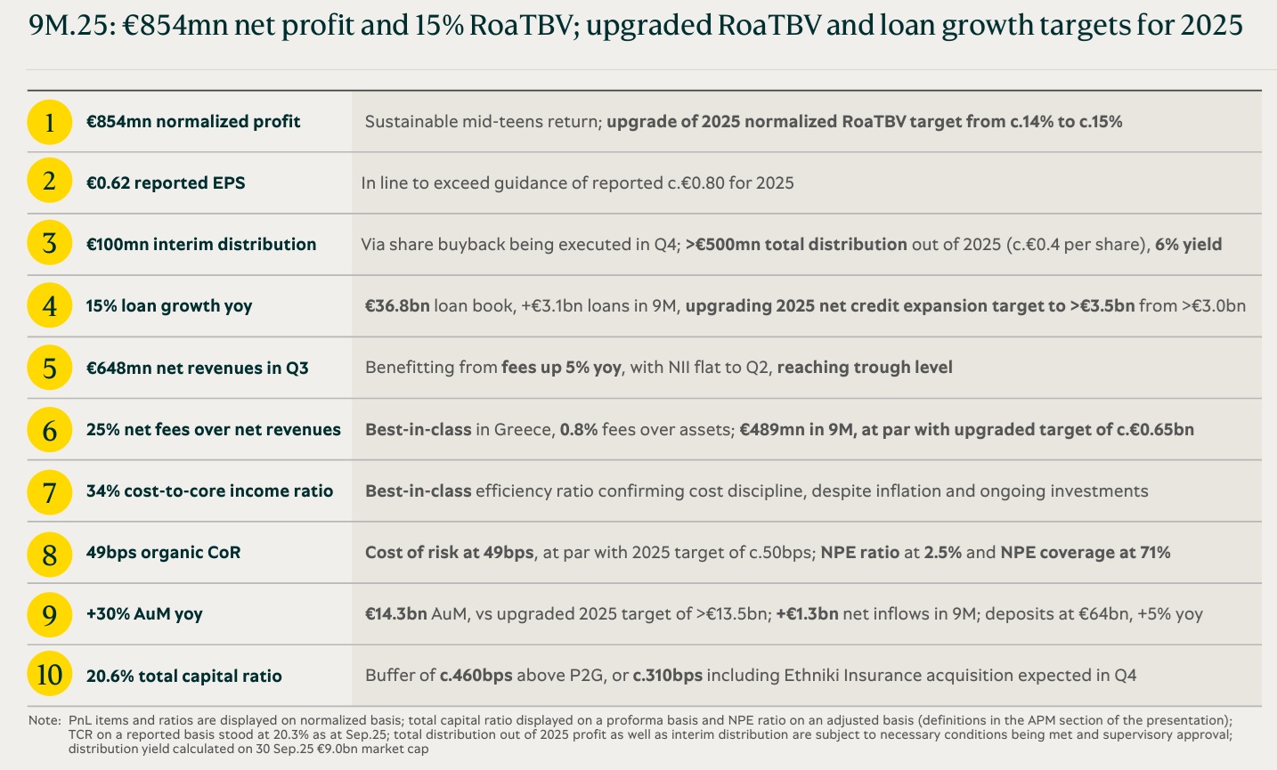 15% αύξηση δανείων ετησίως: Δανειακό χαρτοφυλάκιο 36,8 δισ. ευρώ, +3,1 δισ. δάνεια στο εννεάμηνο, αναβάθμιση του στόχου καθαρής πιστωτικής επέκτασης για το 2025 σε >3,5 δισ. ευρώ από >3,0 δισ. ευρώ.