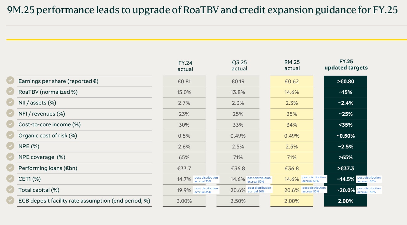 Κέρδος κανονικοποιημένο 854 εκατ. ευρώ: Διατηρήσιμη απόδοση μέσου διψήφιου ποσοστού και αναβάθμιση του στόχου κανονικοποιημένου RoaTBV για το 2025 από περίπου 14% σε περίπου 15%.