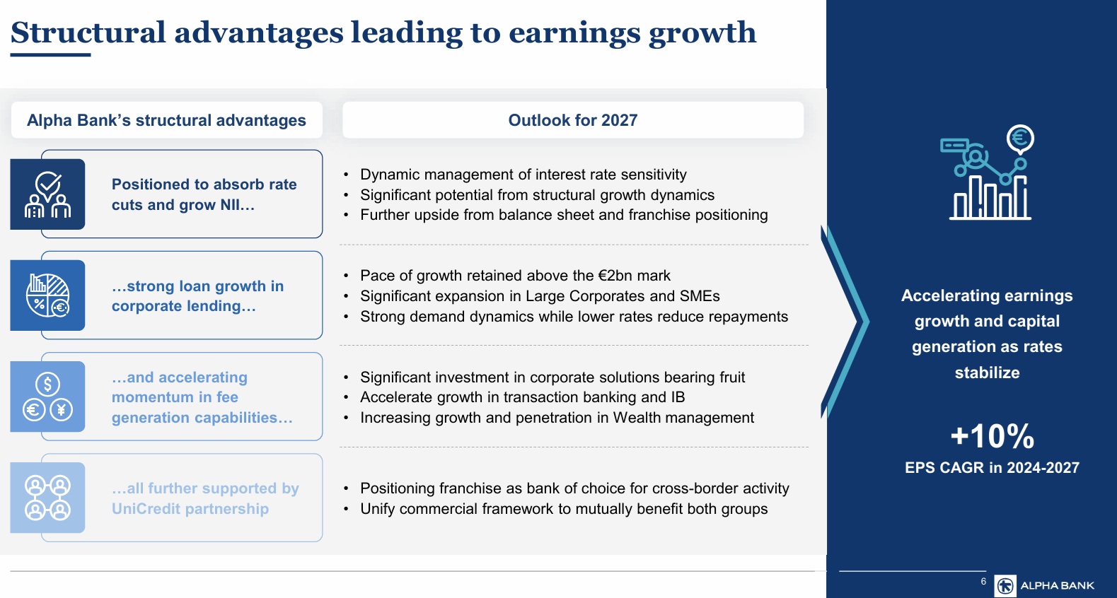 Σε ό,τι αφορά το outlook έως το 2027, στην παρουσίαση της Alpha Βank καταγράφεται η στόχευση για Μέσο Ετήσιο Ρυθμό Ανόδου των Κερδών ανά Μετοχή (EPS CAGR) και δημιουργία κεφαλαίου κατά 10% για όλη την περίοδο 2024-2027.