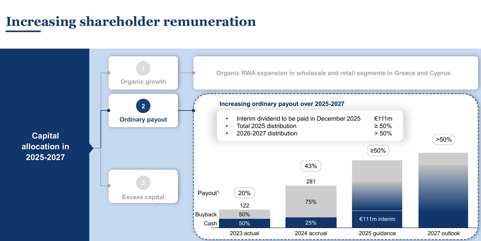 Η διοίκηση της τράπεζας στοχεύει σε αύξηση της διανομής προς τους μετόχους για την περίοδο 2025-2027, ενώ το επιπλέον κεφάλαιο προτίθεται να το διαθέσει για έξτρα μερίσματα και επαναγορές καθώς και για εξαγορές. Επισημαίνεται πως σε ό,τι αφορά τις εξαγορές έχουν υιοθετηθεί αυστηρά κριτήρια. Δεν θα επηρεάζουν την πολιτική διανομών και θα εξασφαλίζουν απόδοση επένδυσης άνω του 15% ενώ θα λειτουργούν ενισχυτικά στα κέρδη ανά μετοχή.