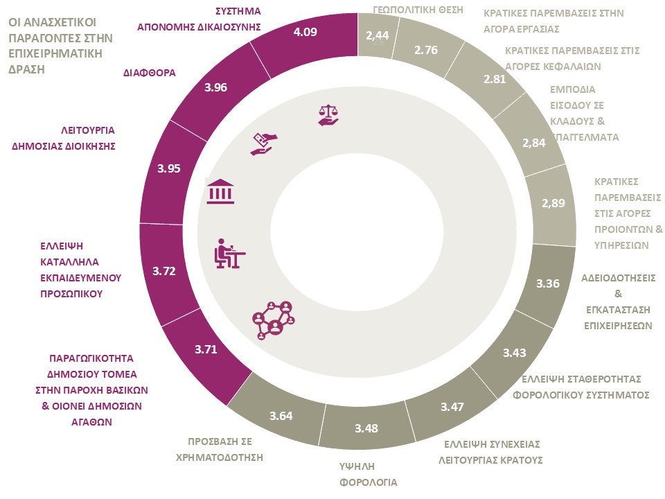 Αξίζει να σημειωθεί ότι από το 2021 η ανησυχία για τη λειτουργία της δικαιοσύνης έχει αυξηθεί αισθητά, καθιστώντας την έναν από τους σημαντικότερους ανασταλτικούς παράγοντες για την επιχειρηματική δράση. Παράλληλα, ενισχύεται η ευαισθητοποίηση απέναντι στο ζήτημα της διαφθοράς, ενώ μειώνεται η σχετική σημασία που αποδίδεται στη φορολογική επιβάρυνση και στη σταθερότητα του φορολογικού συστήματος.