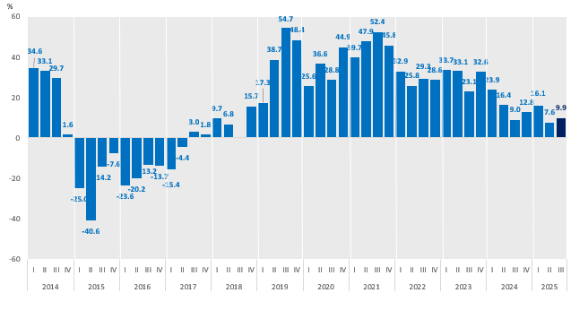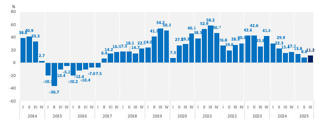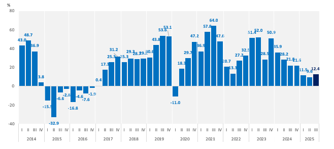 Συγκεκριμένα, η τιμή του Δείκτη Οικονομικής Συγκυρίας, ο οποίος προκύπτει ως ο μέσος όρος της διαφοράς μεταξύ των ποσοστών «θετικών» και «αρνητικών» απαντήσεων για πέντε βασικές μεταβλητές (ρυθμός οικονομικής μεγέθυνσης, ανεργία, ιδιωτικές επενδύσεις παγίου κεφαλαίου, εξαγωγές προϊόντων και υπηρεσιών και ποσοστό μεταβολής του γενικού επιπέδου των τιμών) διαμορφώθηκε σε 12,4% το γ’ τρίμηνο 2025, έναντι 9,6% το προηγούμενο τρίμηνο και 21,8% το αντίστοιχο τρίμηνο του 2024. Η ελαφρά αυτή βελτίωση αποδίδεται κυρίως στην ενίσχυση των προσδοκιών για επενδύσεις παγίου κεφαλαίου και στην βελτίωση των εκτιμήσεων για τον πληθωρισμό, ενώ οι υπόλοιποι δείκτες, ιδιαίτερα ο ρυθμός μεγέθυνσης, σημείωσαν κάμψη.