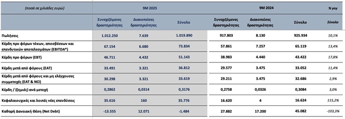 Σε σύγκριση με το αντίστοιχο εννεάμηνο του 2024, οι πωλήσεις σημείωσαν αύξηση 10,1%, η λειτουργική κερδοφορία (EBITDA) 13,4%, τα κέρδη προ φόρων (ΕΒΤ) 17,8%, τα καθαρά κέρδη μετά από φόρους (ΕAΤ) 11,4%, σημειώνει η σχετική ανακοίνωση.