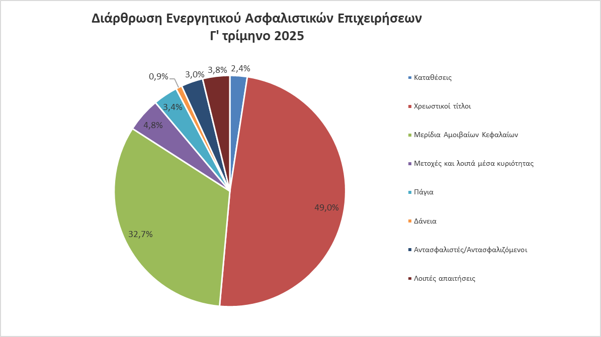 Η αξία των συνολικών τοποθετήσεων των ασφαλιστικών επιχειρήσεων σε χρεωστικούς τίτλους αυξήθηκε στα 10.719 εκατ. ευρώ στο τέλος του γ΄ τριμήνου του 2025, έναντι 10.621 εκατ. ευρώ το προηγούμενο τρίμηνο, εξέλιξη που οφείλεται κυρίως σε καθαρές αγορές ομολόγων του εξωτερικού. Το ποσοστό των χρεωστικών τίτλων επί του συνολικού ενεργητικού μειώθηκε στο 49,0% το γ΄ τρίμηνο του 2025, έναντι 49,4% το προηγούμενο τρίμηνο.