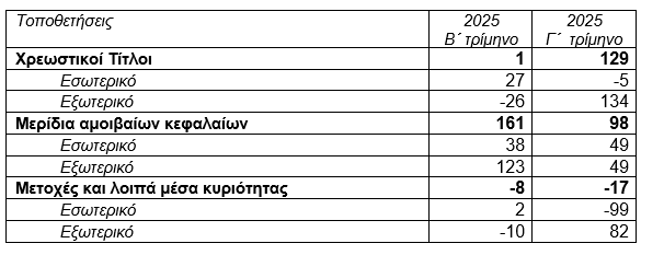 Η αξία των συνολικών τοποθετήσεων σε μετοχές και λοιπά μέσα κυριότητας μειώθηκε στα 1.049 εκατ. ευρώ, έναντι 1.057 εκατ. ευρώ το προηγούμενο τρίμηνο, εξέλιξη που οφείλεται κυρίως σε καθαρές πωλήσεις μετοχών του εσωτερικού, οι οποίες αντισταθμίστηκαν εν μέρει από καθαρές αγορές μετοχών του εξωτερικού. Το ποσοστό των συνολικών τοποθετήσεων σε μετοχές επί του συνόλου του ενεργητικού παρέμεινε σχεδόν αμετάβλητο στο 4,8% το γ΄ τρίμηνο του 2025.