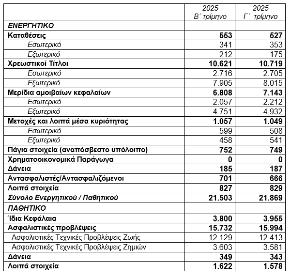 Από την πλευρά του παθητικού, τα ίδια κεφάλαια αυξήθηκαν στα 3.955 εκατ. ευρώ στο τέλος του γ΄ τριμήνου του 2025, έναντι 3.800 εκατ. ευρώ το προηγούμενο τρίμηνο. Οι ασφαλιστικές τεχνικές προβλέψεις αυξήθηκαν κατά 262 εκατ. ευρώ και διαμορφώθηκαν στα 15.994 εκατ. ευρώ.