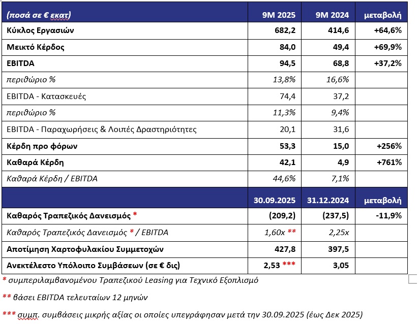 Τα καθαρά κέρδη μετά φόρων του Ομίλου ανήλθαν σε €42,1 εκατομμύρια στο φετινό εννεάμηνο έναντι €4,9 εκατομμυρίων στην αντίστοιχη περίοδο του 2024, όταν είχαν λογιστικοποιηθεί σημαντικά αυξημένες προβλέψεις (Λίβανος), και λόγω των βελτιωμένων χαρακτηριστικών κερδοφορίας των εκτελούμενων έργων και της μείωσης του δανεισμού και των συνδεδεμένων χρηματοοικονομικών εξόδων.