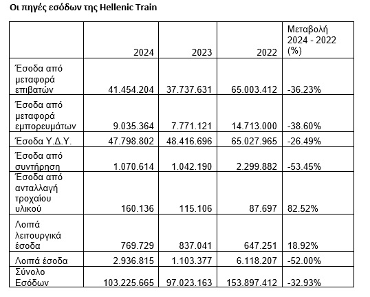 - Όμως, η κατάρρευση των εσόδων από μεταφορά επιβατών και εμπορευμάτων (μείωση 36% και 38%, αντίστοιχα) προκάλεσε καθίζηση της τάξεως του -33% στα συνολικά έσοδα μεταξύ 2022 και 2024.