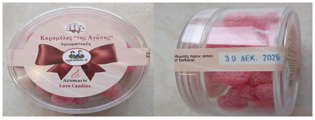 Καραμέλες «της Αγάπης-Αρωματικές» με ημερομηνία ανάλωσης πριν από τις 30 ΔΕΚ. 2026, συσκευασίας καθαρού βάρους περίπου 110g της εταιρείας με διακριτικό τίτλο «αρκαδιανή» που εδρεύει στο Ψάρι Αρκαδίας.