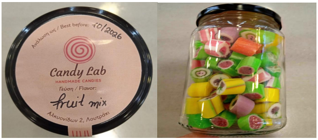Καραμέλες «fruit mix» με ημερομηνία ανάλωσης ως 10/2026, συσκευασίας καθαρού βάρους περίπου 230g, το οποίο παράγεται και συσκευάζεται στην Ελλάδα από την «Candy Lab» που εδρεύει στο Λουτράκι Κορινθίας.