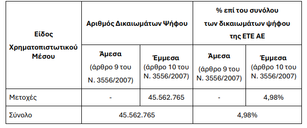 Σε συνέχεια σχετικής γνωστοποίησης σημαντικών αλλαγών στα δικαιώματα ψήφου της Τράπεζας από την “Principal Global Investors, LLC” σύμφωνα με τον Ν. 3556/2007, καθώς και της από 23.01.2026 γνωστοποίησης που έλαβε η Τράπεζα από την “Principal Financial Group”, υπό την ιδιότητά της ως τελική μητρική εταιρεία της “Principal Global Investors, LLC”, η Τράπεζα γνωστοποιεί με την παρούσα, ότι το συνολικό ποσοστό δικαιωμάτων ψήφου τα οποία αντιστοιχούν σε ισάριθμες κοινές, ονομαστικές, μετά ψήφου, άυλες μετοχές που κατέχει έμμεσα η “Principal Financial Group”, από την ημερομηνία που αυτα περιήλθαν στην κατοχή της “Principal Global Investors, LLC”, κατήλθε στις 21.01.2026 του ελάχιστου ορίου του 5% επί του συνόλου των δικαιωμάτων ψήφου της Τράπεζας.