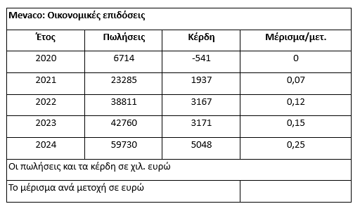 Η εκτίναξη των οικονομικών επιδόσεων της Mevaco σε συνδυασμό με τη σημαντική άνοδο που έχει καταγράψει ο Γενικός Δείκτης του ΧΑ έχουν οδηγήσει κατά την τελευταία πενταετία την τιμή της μετοχής της εισηγμένης από το 1,7 στα 9,65 ευρώ (περίπου +450%). Βέβαια, κατά την ίδια περίοδο, το μέρισμα από το μηδέν του 2021 και το 0,07 ευρώ του 2022 διαμορφώθηκε πέρυσι στο 0,25 ευρώ και φέτος προβλέπεται να κινηθεί σε ακόμη πιο υψηλά επίπεδα (η εταιρεία διακρίνεται για την άριστη ρευστότητά της).