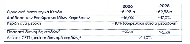 Η ανάπτυξη θα προέλθει κυρίως από την οργανική αύξηση των χορηγήσεων (σωρευτική ετήσια μεταβολή +7,5% περίπου), από τα οφέλη και τις συνέργειες από την ηγετική θέση στην Κύπρο, από την εξαγορά της Eurolife και την περαιτέρω ανάπτυξη των εργασιών στη Διαχείριση Περιουσίας (σωρευτική ετήσια μεταβολή κατά περίπου +16% των υπό διαχείριση κεφαλαίων). Οι χρηματοοικονομικοί στόχοι της περιόδου 2026-2028 έχουν ως εξής:
