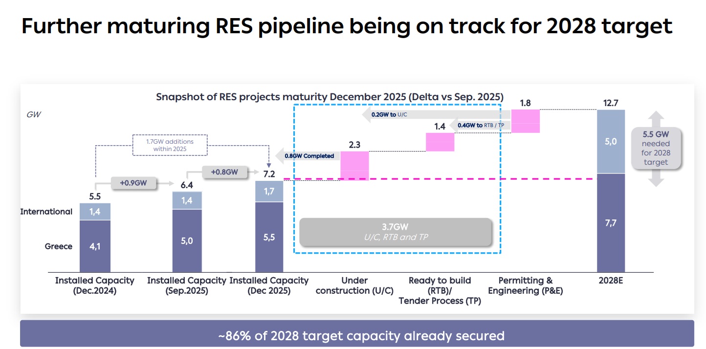Συνολικά, και ενώ είμαστε στις αρχές της πρώτης χρονιάς του τριετούς επενδυτικού του πλάνου (2026-2028), ο όμιλος διαθέτει ένα γιγάντιο portfolio 7,2 GW εν λειτουργία έργων ΑΠΕ που μαζί με τα 3,7 GW υπό κατασκευή ή έτοιμα για κατασκευή, αθροίζει 10,9 GW. Εχει δηλαδή πετύχει νωρίτερα του αναμενόμενου το 86% του στόχου για 12,7 ΑΠΕ το 2028.