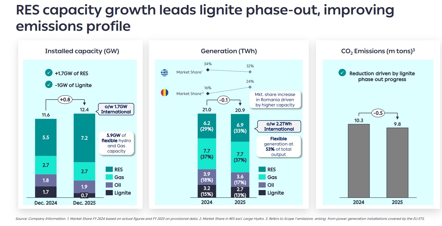 - ΑΠΕ και ευέλικτη παραγωγή (μπαταρίες, υδροηλεκτρικά) καλύπτουν πλέον το 80% του συνολικού capacity του ομίλου.
