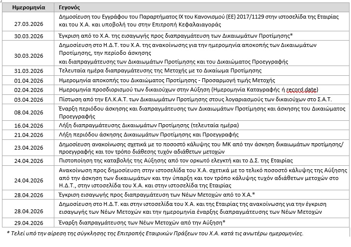 Το αναμενόμενο χρονοδιάγραμμα της ολοκλήρωσης της Αύξησης και της εισαγωγής προς διαπραγμάτευση των Νέων Μετοχών είναι το εξής:
