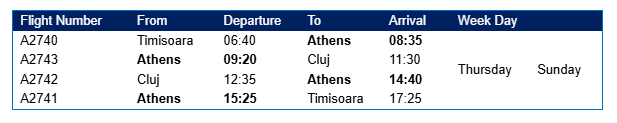Η Αθήνα δεν αποτελεί μόνο έναν από τους δημοφιλέστερους προορισμούς αναψυχής για τους Ρουμάνους ταξιδιώτες, αλλά και έναν σημαντικό επιχειρηματικό κόμβο στην περιοχή, με ολοένα αυξανόμενες εμπορικές ανταλλαγές, επενδυτικές ροές και ζήτηση για εταιρικά ταξίδια μεταξύ Ελλάδας και Ρουμανίας. Με την έναρξη των απευθείας πτήσεων από την Κλουζ-Ναπόκα και την Τιμισοάρα, προσφέρουμε σε εταιρείες και επαγγελματίες ταξιδιώτες βολικά ωράρια, μειωμένους χρόνους ταξιδιού και ένα άνετο προϊόν πλήρους εξυπηρέτησης, προσαρμοσμένο στις ανάγκες των σύντομων και μεσαίων επαγγελματικών μετακινήσεων.»