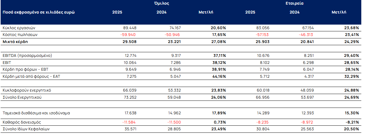 Οι σημαντικότερες μεταβολές αποτελεσμάτων του Ομίλου για το 2025, σε σύγκριση με τα αντίστοιχα του 2024, συνοψίζονται στα εξής: