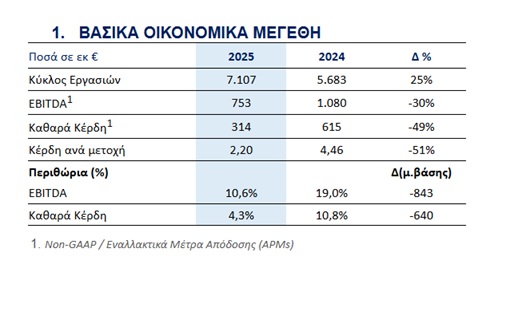 - Κέρδη προ Φόρων, Τόκων και Αποσβέσεων (EBITDA) διαμορφώθηκαν στα €753 εκατ., έναντι €1.080 εκατ. το 2024. Η απόδοση το 2025 επηρεάστηκε αρνητικά από ζημίες στον υπoτομέα M Power Projects (MPP) (ο οποίος πλέον εντάσσεται στον τομέα Renewables, Storage & Energy Transition - MRES ET).
