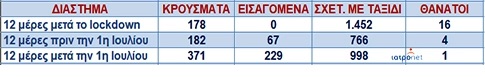 Το 12ήμερο που είχε προηγηθεί του ανοίγματος, δηλαδή από 18 έως 30 Ιουνίου, είχαν καταγραφεί 182 κρούσματα. Υπάρχει, δηλαδή, αύξηση 103,8%.