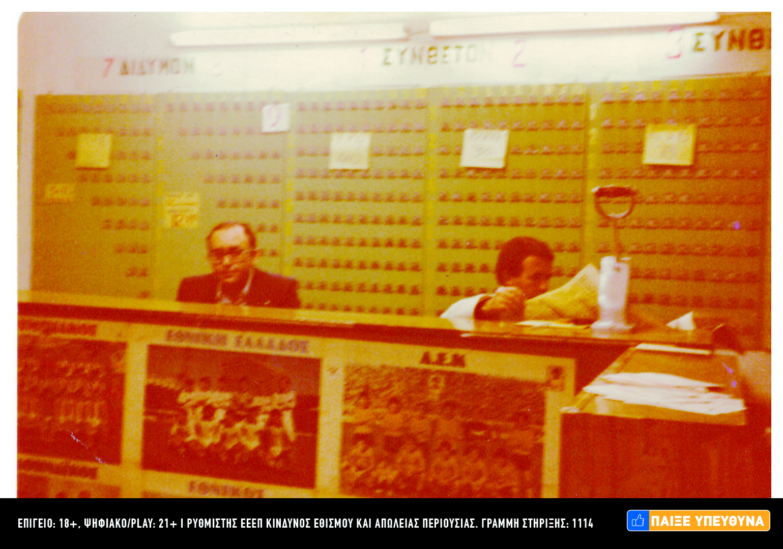 Η πρώτη φωτογραφία είναι τραβηγμένη το 1982, τότε που το πρακτορείο διαχειριζόταν ο Κώστας Δημητρίου. Εκείνη την εποχή, οι πίνακες ήταν χειρόγραφοι και τα δεδομένα των παιχνιδιών αποθηκεύονταν σε κάψουλες. Στους τοίχους υπήρχαν ταμπλό για τα χαρτάκια του ιπποδρόμου, στο ΠΡΟΠΟ κολλούσαν ταινίες και οι στήλες στα μεταβλητά συστήματα γράφονταν με το χέρι.