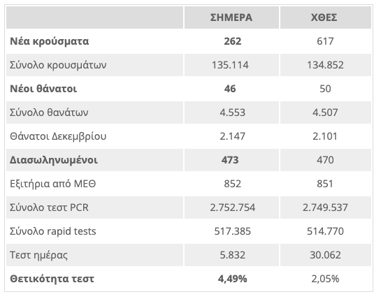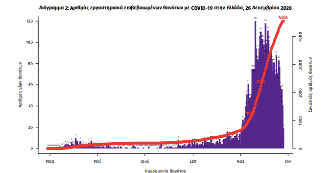 Τέλος, έχουμε 46 ακόμα καταγεγραμμένους θανάτους και 4553 θανάτους συνολικά στη χώρα. 1843 (40.5%) γυναίκες και οι υπόλοιποι άνδρες. Η διάμεση ηλικία των θανόντων συμπολιτών μας ήταν τα 79 έτη και το 95.4% είχε κάποιο υποκείμενο νόσημα ή/και ηλικία 70 ετών και άνω.