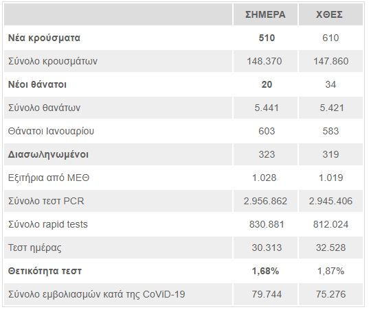 Εχουμε 20 νέους θανάτους από τη νόσο COVID-19, φθάνοντας τους 5441 θανάτους συνολικά στη χώρα, εκ των οποίων 3213 (59.1%) άνδρες. Η διάμεση ηλικία των θανόντων συμπολιτών μας ήταν τα 79 έτη και το 95.4% είχε κάποιο υποκείμενο νόσημα ή/και ηλικία 70 ετών και άνω.