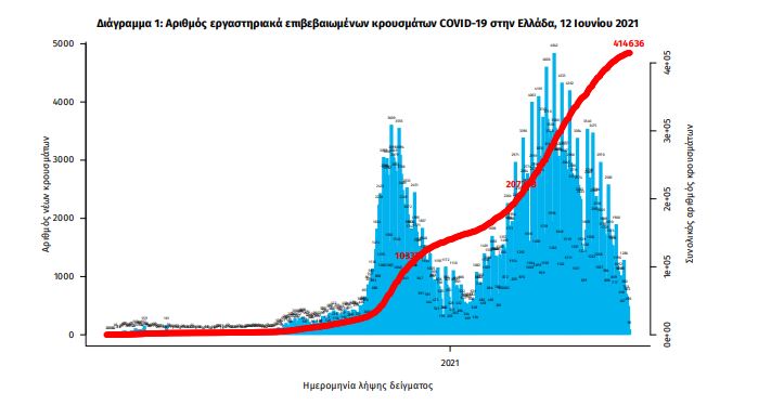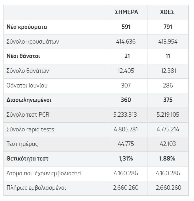 Τα νέα εργαστηριακά επιβεβαιωμένα κρούσματα της νόσου που καταγράφηκαν τις τελευταίες 24 ώρες είναι 591, εκ των οποίων 2 εντοπίστηκαν κατόπιν ελέγχων στις πύλες εισόδου της χώρας. Ο συνολικός αριθμός των κρουσμάτων ανέρχεται σε 414.636 (ημερήσια μεταβολή +0.2%), εκ των οποίων 51.2% άνδρες.