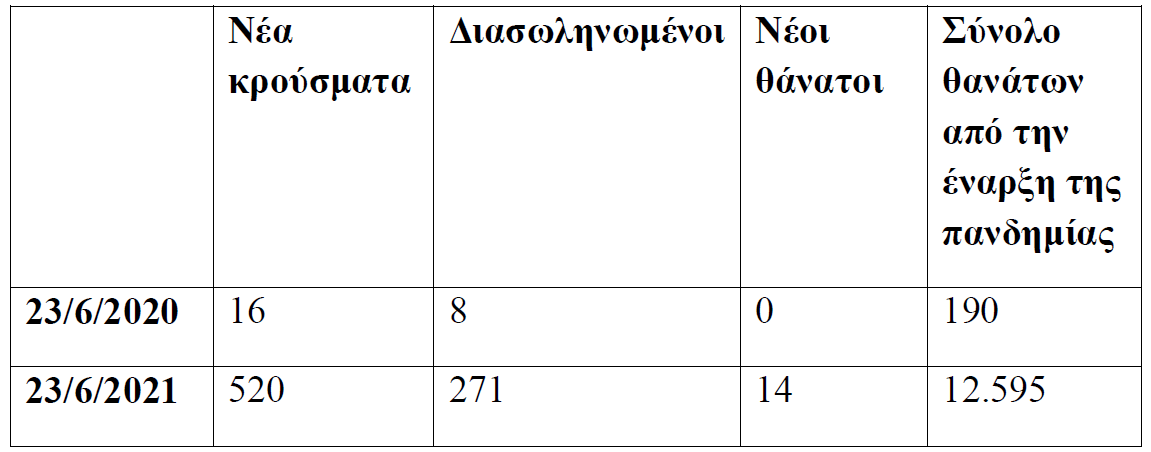 Μια μέρα σαν τη σημερινή, ένα χρόνο πριν, η επιδημιολογική εικόνα της χώρας ήταν πολύ καλύτερη από αυτή που βιώνουμε τώρα, αλλά και οι συνθήκες ήταν διαφορετικές. Στις 23 Ιουνίου 2020, μόλις 4 μήνες μετά τον εντοπισμό της «ασθενή μηδέν» στη χώρα, είχαν καταγραφεί συνολικά μόλις 3.302 κρούσματα κορωνοϊού από την έναρξη της πανδημίας. Σήμερα αυτά έχουν φτάσει τις 419.455. Εκείνη τη μέρα είχαν επιβεβαιωθεί 16 νέες λοιμώξεις, έναντι 520 χθες, ενώ οι διασωληνωμένοι ασθενείς στις ΜΕΘ της χώρας ήταν τότε 8 και σήμερα 271. Οι θάνατοι από την έναρξη της πανδημίας εκτοξεύτηκαν στις 12.595 σήμερα, έναντι μόλις 190 ένα χρόνο πριν.