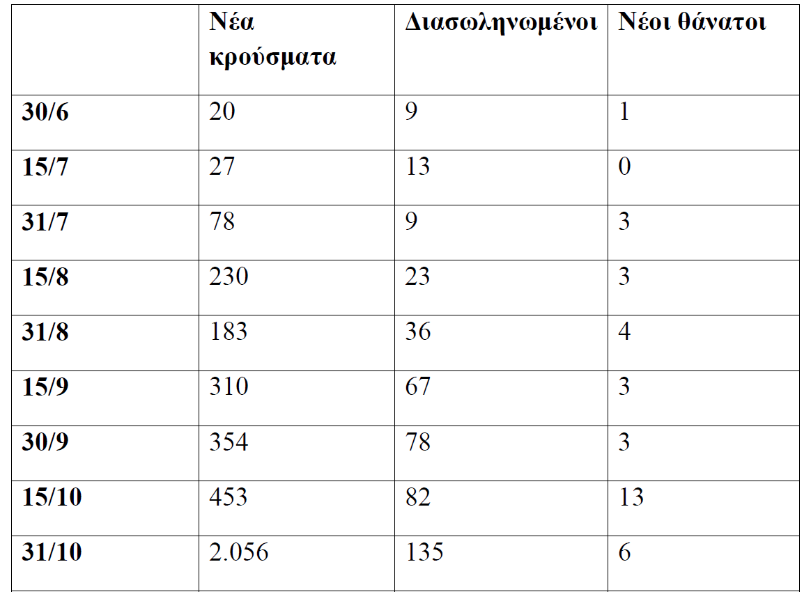 Η πορεία της επιδημίας στη διάρκεια του περσινού καλοκαιριού ως το φθινόπωρο δείχνει τον τρόπο με τον οποίο ακολούθησε μια προοδευτική αύξηση κρουσμάτων, διασωληνωμένων και θανάτων τον μήνα Ιούλιο, και σημαντική επιδείνωση των δεικτών τον Αύγουστο και τον Σεπτέμβριο, που οδήγησε στην «έκρηξη» του Οκτωβρίου και στο εφιαλτικό δεύτερο κύμα. Όπως φαίνεται στον πίνακα που ακολουθεί, υπήρξε τριπλασιασμός κρουσμάτων και διασωληνωμένων μέσα στο πρώτο δεκαπενθήμερο του Αυγούστου, περαιτέρω διπλασιασμός τον Σεπτέμβριο και εκθετική αύξηση τον Οκτώβριο, που είχε ως αποτέλεσμα οι καθημερινές μολύνσεις στην Ελλάδα να εκτοξευτούν από τις 453 στις 2.056 μέσα σε μόλις 15 μέρες.