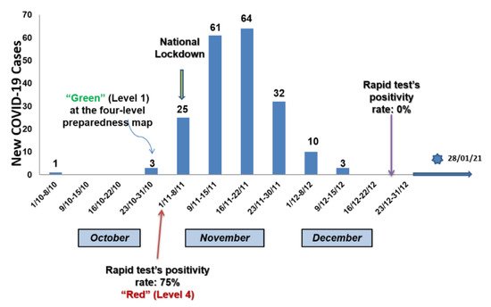 Στο παρακάτω γράφημα, από την υπό δημοσίευση μελέτη των επιστημόνων του Πανεπιστημίου Θεσσαλίας, αποτυπώνεται η «έκρηξη» κρουσμάτων κορωνοϊού στη Δεσκάτη το Νοέμβριο του 2020, σε σχέση με τα ελάχιστα ή μηδενικά κρούσματα πριν και μετά από αυτόν.