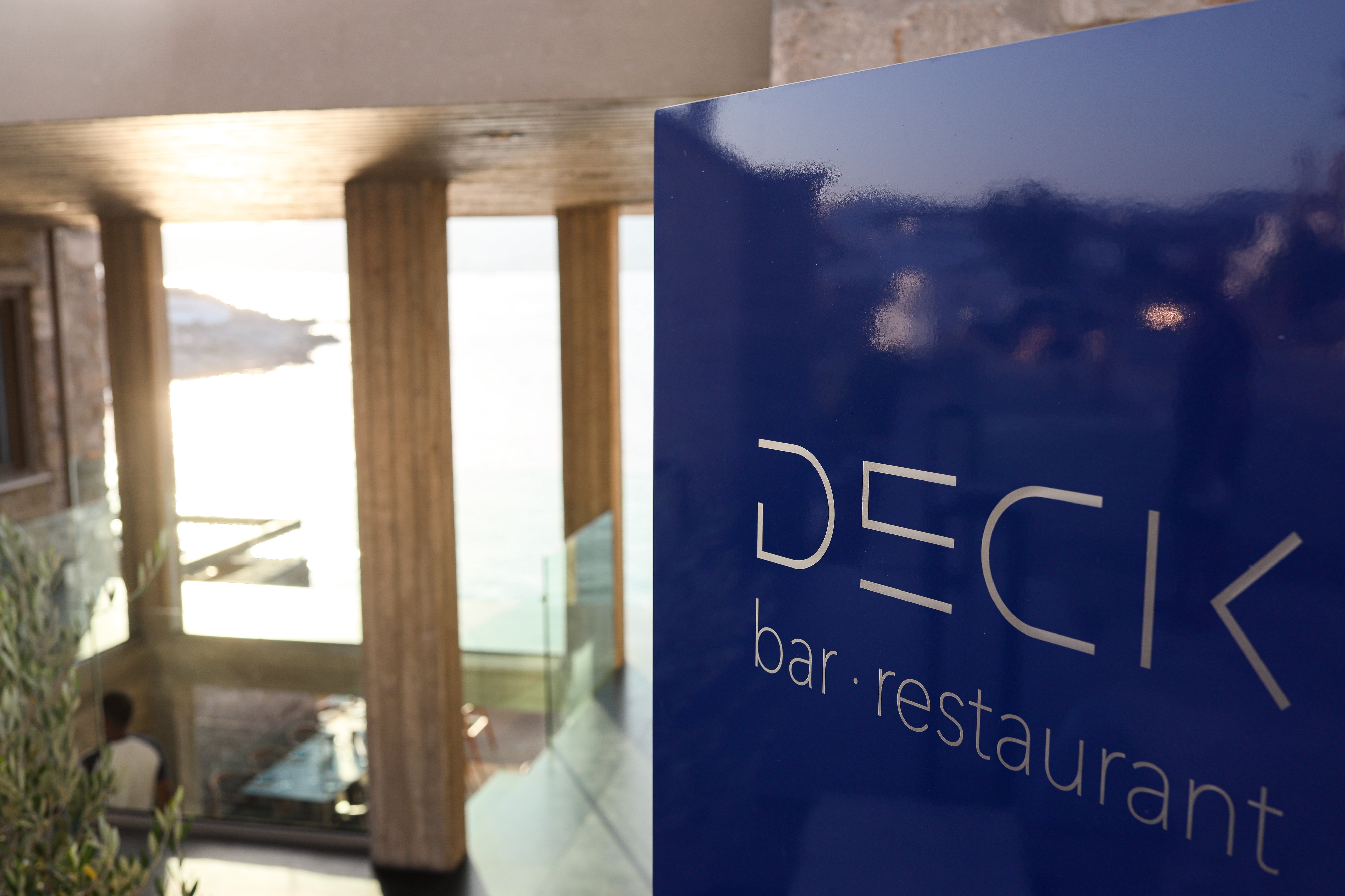 Το DECK Paros λειτουργεί στην υπερυψωμένη βεράντα με θέα στον κόλπο, στο ξύλινο deck πάνω από τη θάλασσα και στον μεγάλο αύλειο χώρο του εξωτερικού καμπύλου μπαρ, απευθείας πάνω από τα βράχια της θάλασσας. Οι ανοιγόμενες οροφές μετατρέπουν τους εσωτερικούς χώρους σε αίθρια, σε συνδυασμό με τα μεγάλα ανοίγματα ανάμεσα στους πέτρινους τοίχους αποκαλύπτουν συγχρόνως τη θέα της θάλασσας και του ουρανού, δημιουργώντας µεγάλα "κάδρα τοπίων" για τον επισκέπτη και ιδανική ατμόσφαιρα για μια αξέχαστη γαστρονομική απόλαυση.